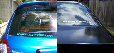 The black car is mine. The blue car is my mom's, who is lovingly letting me advertise on her car. :D Huzzah!